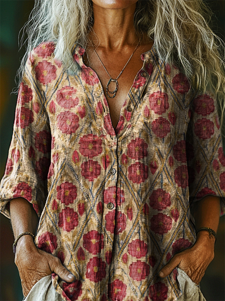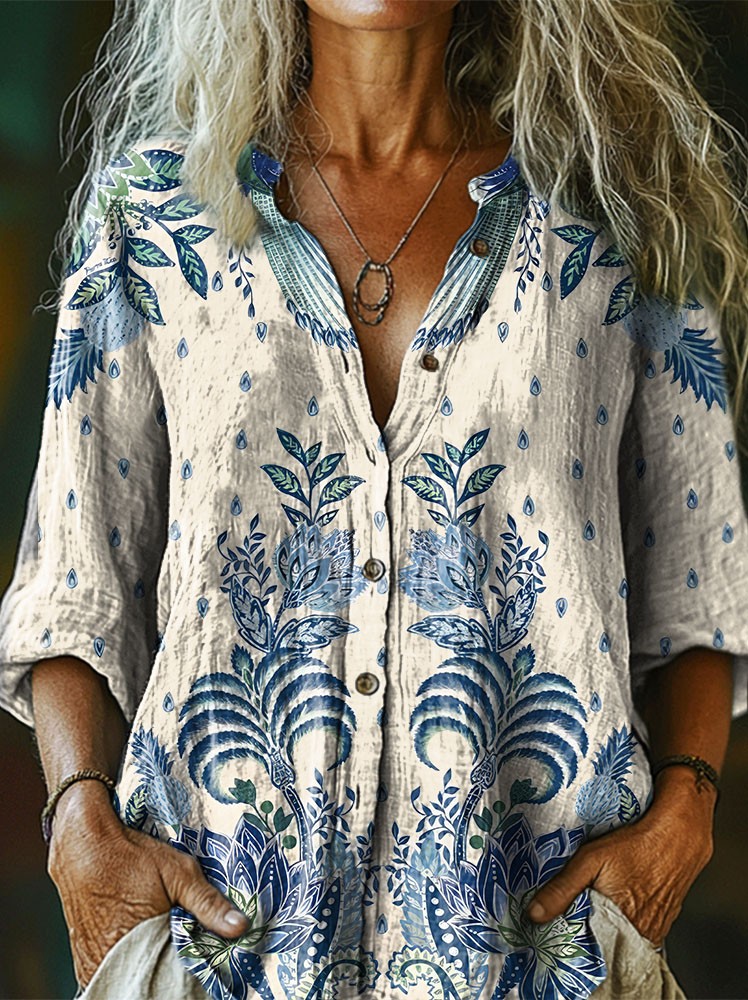 Women's Vintage Bohemian Floral Art Print Casual Cotton Linen Shirt