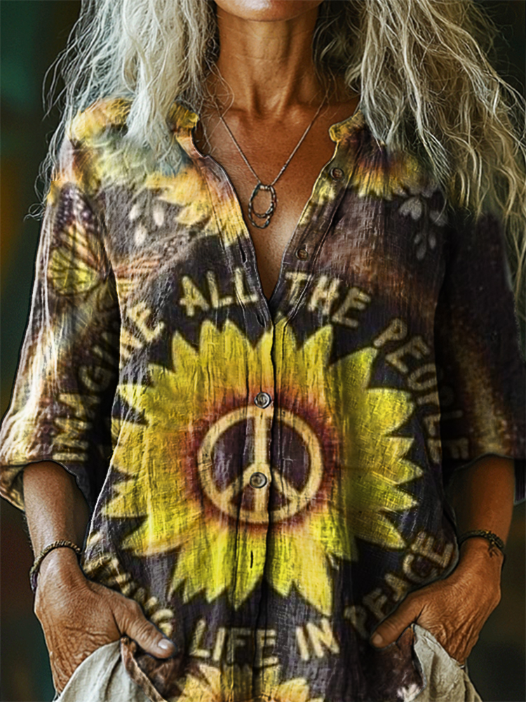 Women's Imagine All The Peace Art Print Casual Cotton Linen Shirt