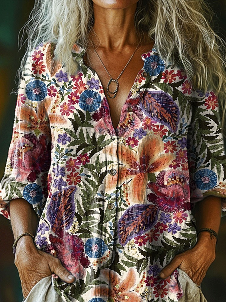 Women's Floral Art Print Linen And Cotton V-neck Casual Shirt