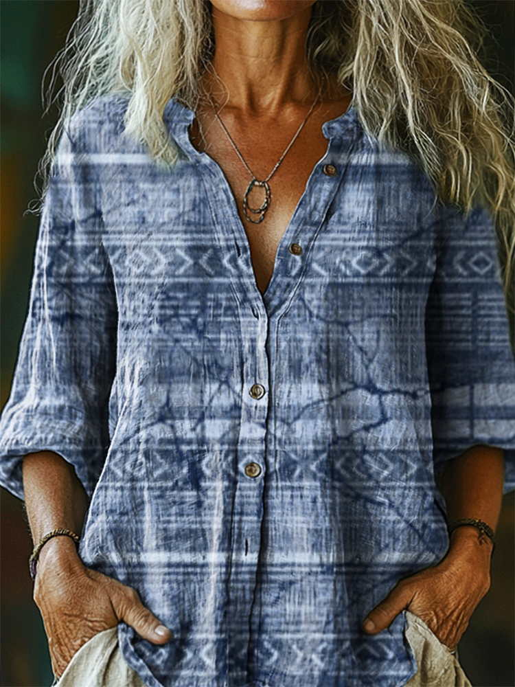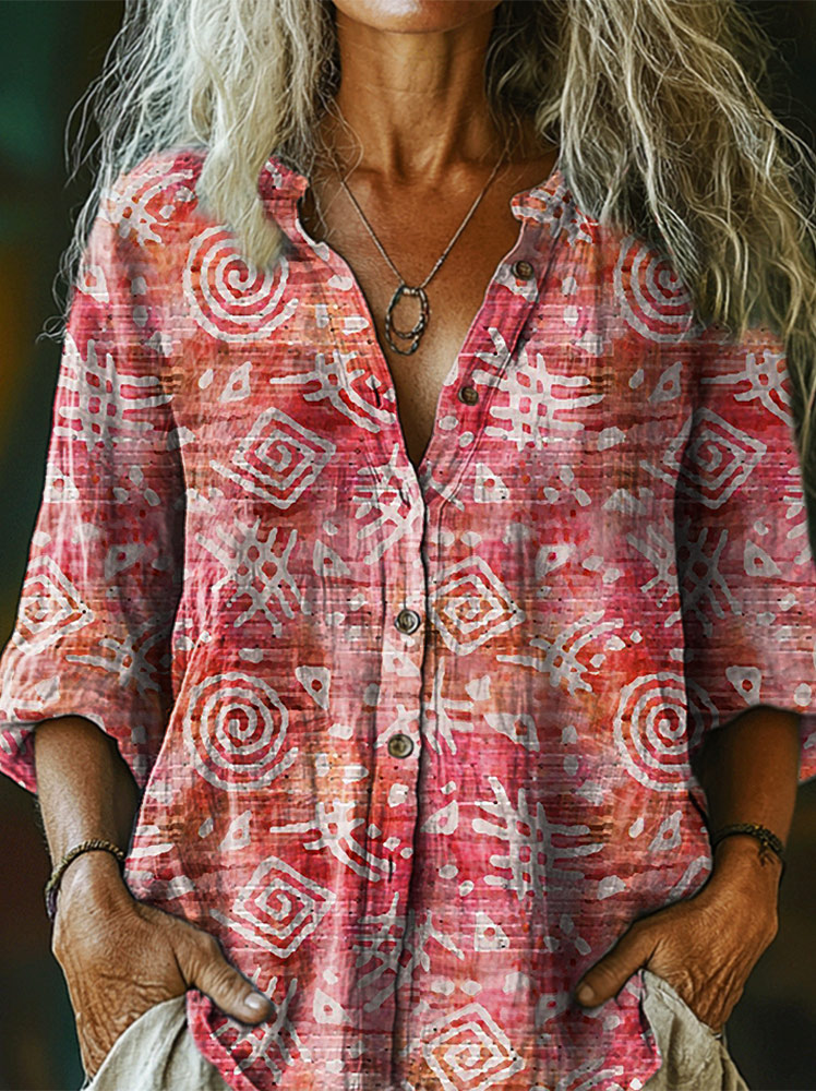 Women's Ethnic Totem Art Pattern Print Casual Cotton Linen Shirt