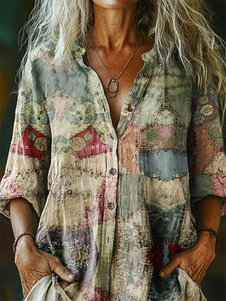 Vintage Floral Patchwork Pattern Art Print Cotton Linen Casual Women's Shirt