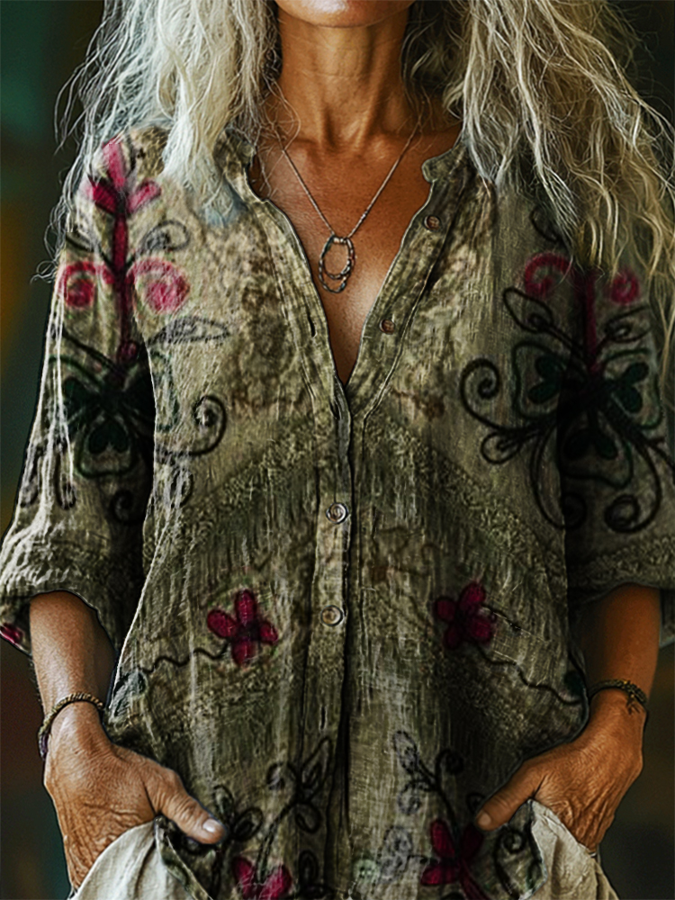 Women's Vintage Floral Art Print Linen And Cotton V-neck Casual Shirt