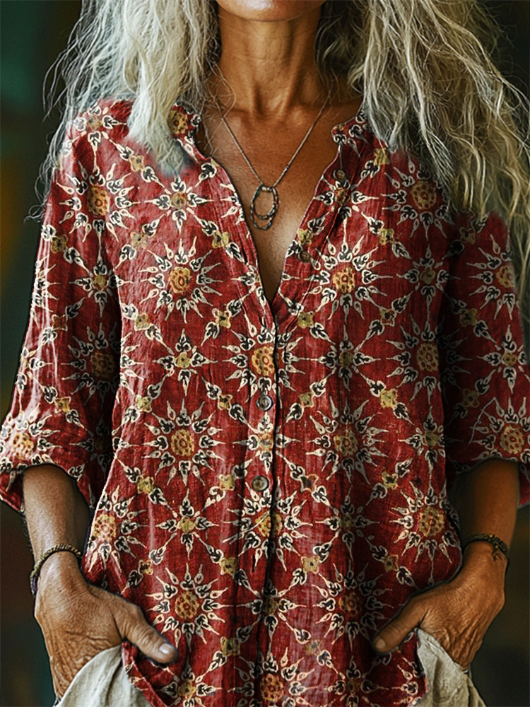 Women's Vintage Ethnic Floral Art Print Casual Cotton Linen Shirt