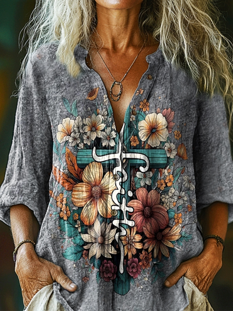 Women's Floral Faith Art Pattern Print Casual Cotton Linen Shirt