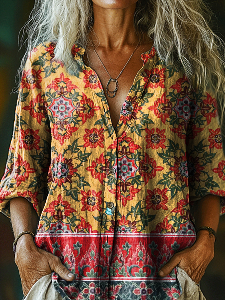Women's Vintage Ethnic Floral Art Print Casual Cotton And Linen Shirt