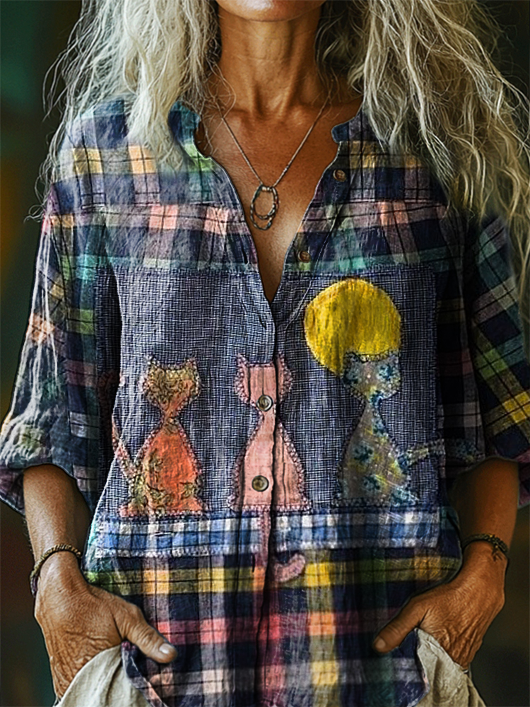 Women's Cat Art Print Casual Cotton Linen Shirt