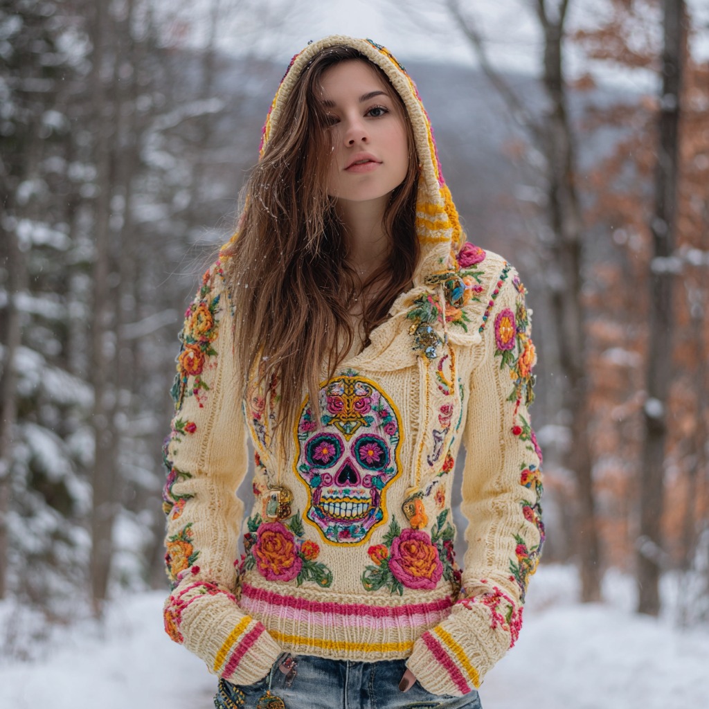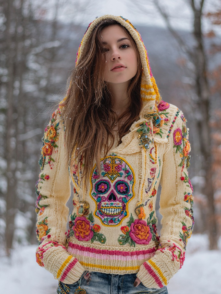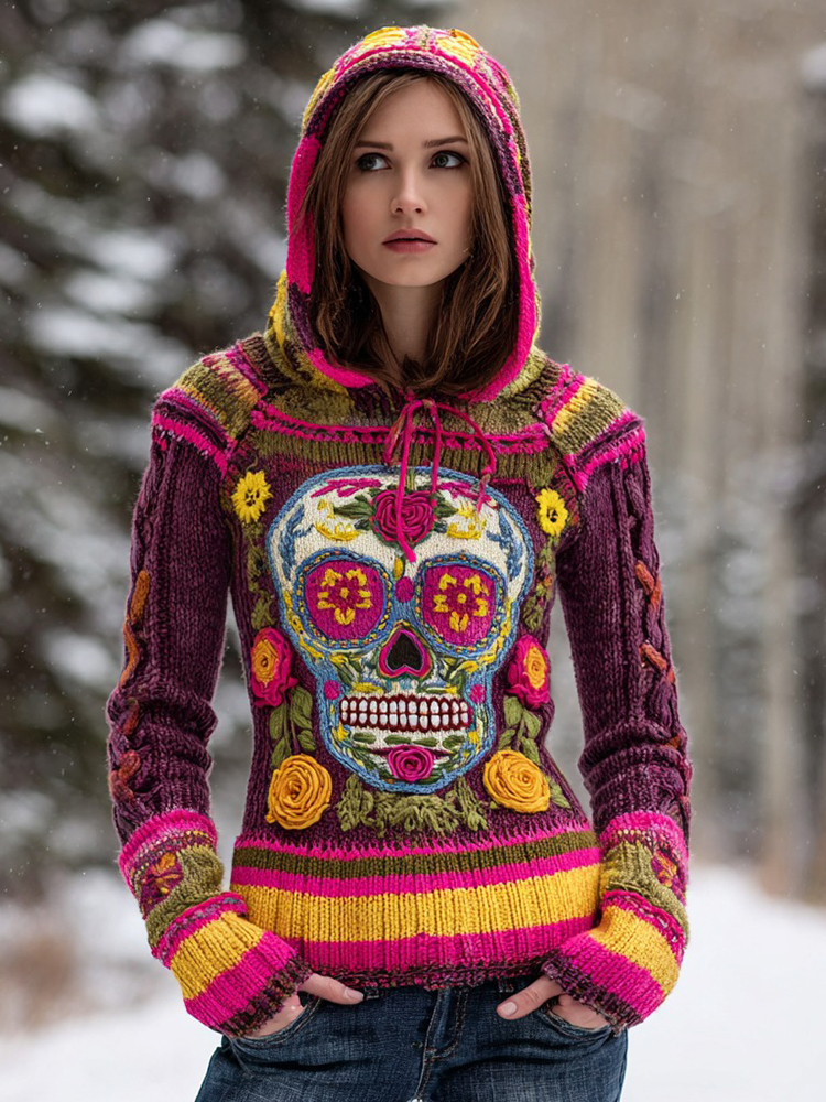 Women's Vintage Sugar Skull And Floral Knit Jacquard Warm Hooded Sweater