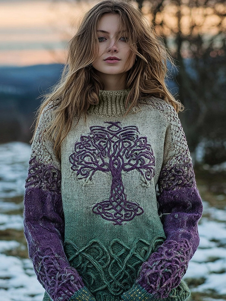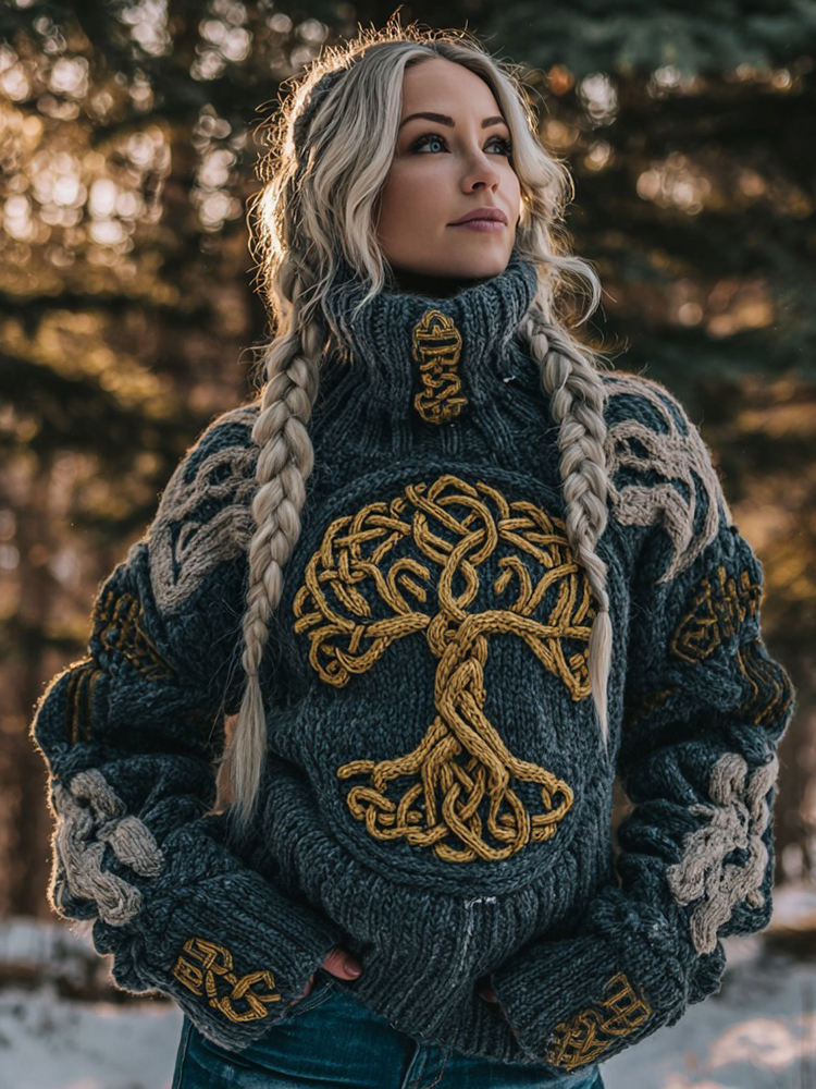 Women's Viking Celtic Knot Tree Of Life Knitted Jacquard Warm Turtleneck Sweater