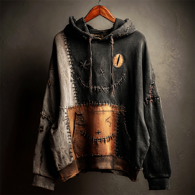 Halloween Black Cat Face Colorblock Patchwork Washed Hoodie