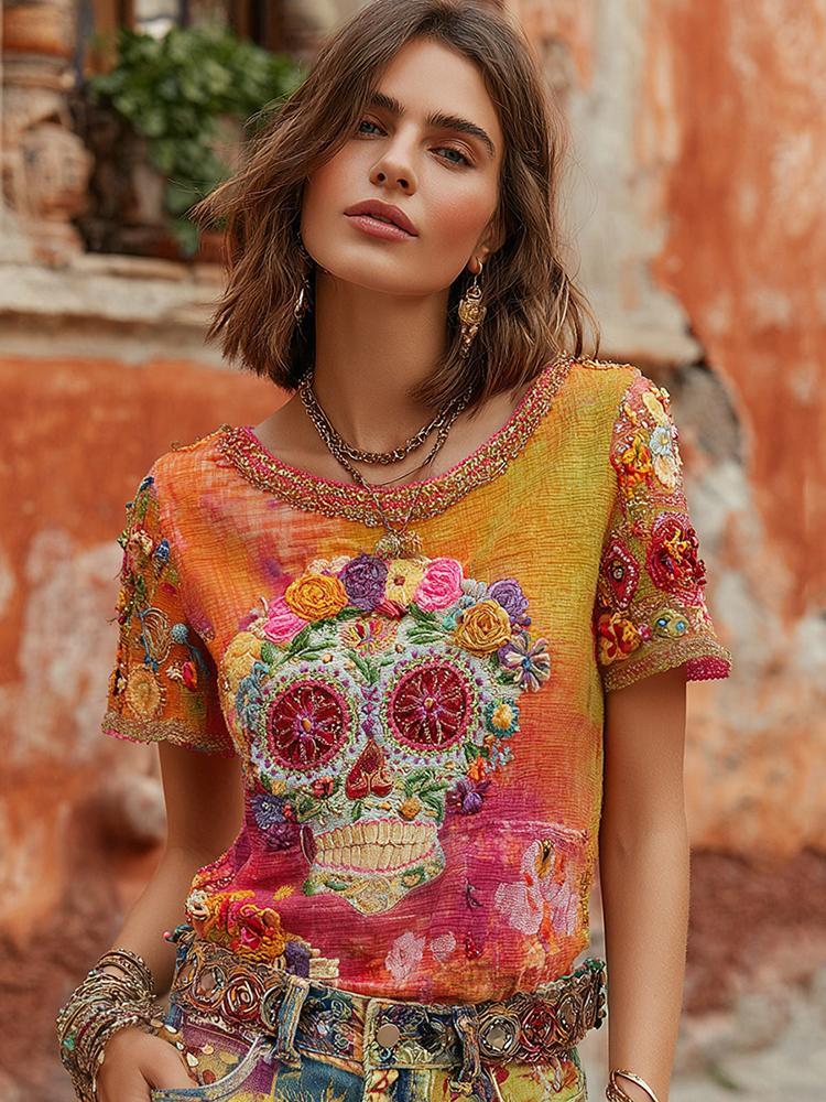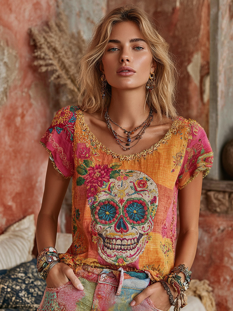 Women's Classic Mexican Sugar Skeleton Catrina Day Of The Dead Inspired Painting Embroidered Casual Linen T-shirt