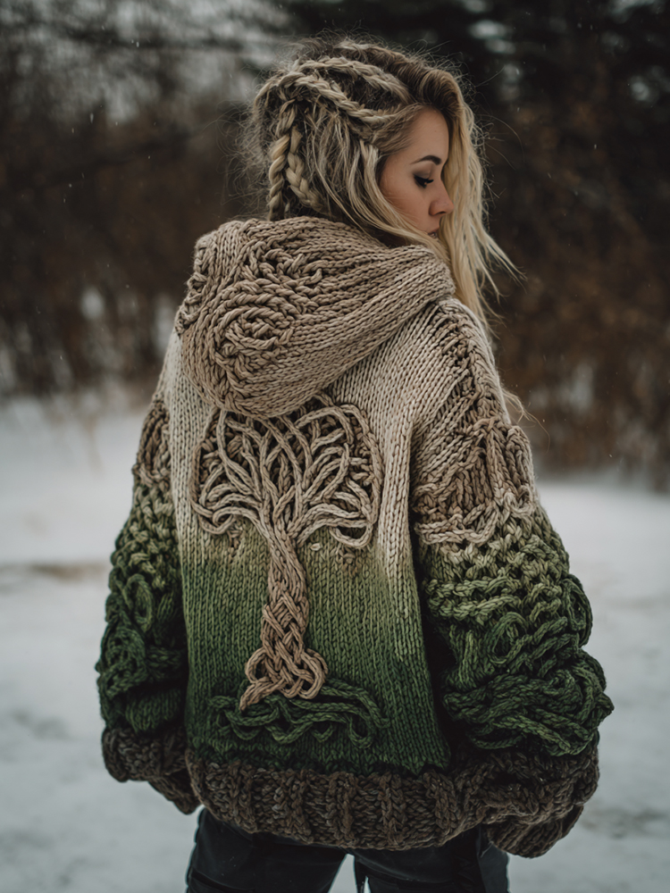 Women's Vintage Viking Tribal Celtic Skull Gradient Art Cozy Knitted Hooded Cardigan