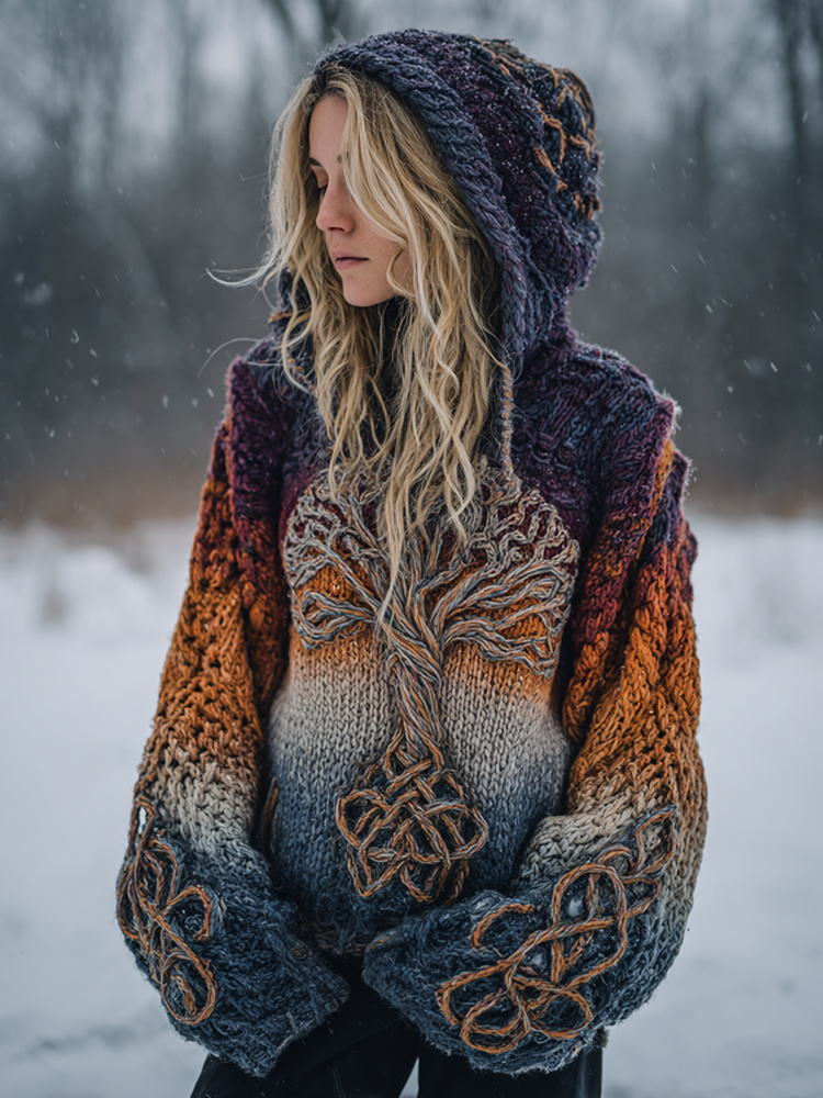 Women's Viking Celtic Knot Rune Knit Jacquard Comfortable Warm Hooded Sweater