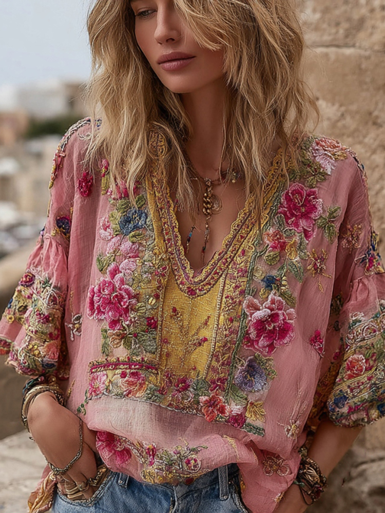 Women's Vintage Bohemian Floral Embroidery Art V-neck T-shirt