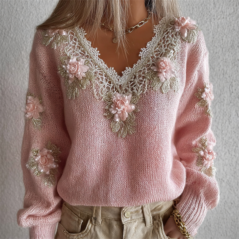 Vintage Pink Flowers Lace V Neck Cozy Knit Sweater