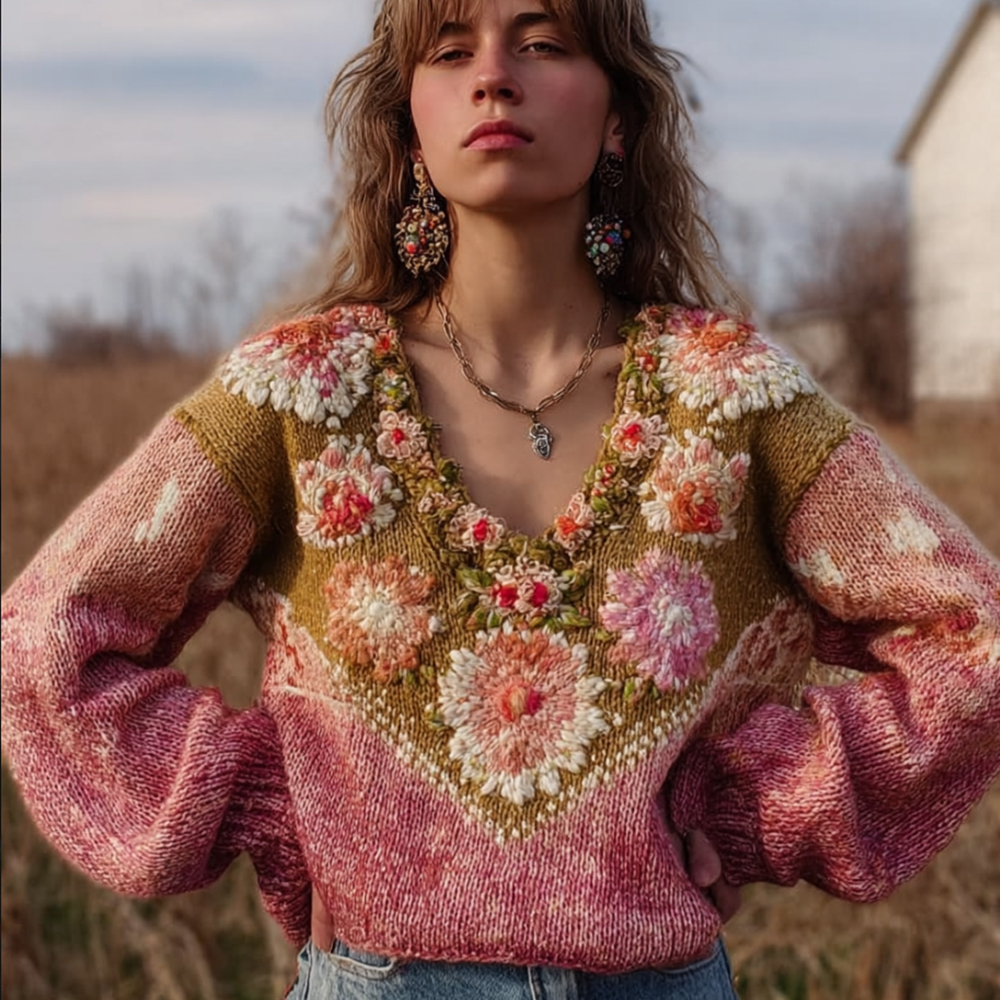 Women's Vintage Flower Gradient V-neck Long-sleeved Sweater