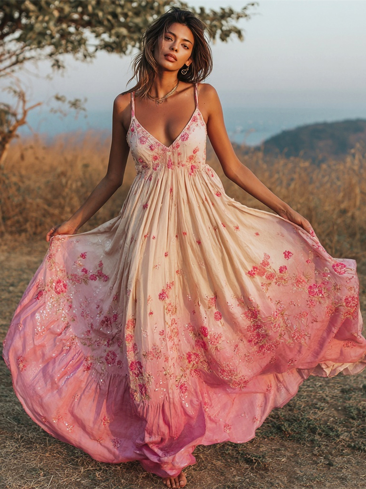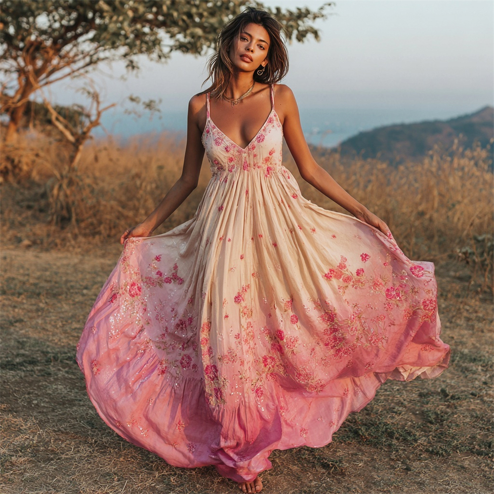 Boho Vintage Floral Embroidery Women's Spaghetti Strap Maxi Dress