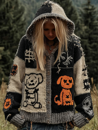 Contrast Color Dog Spiderweb Patchwork Sewn Cozy Knitted Hooded Cardigan