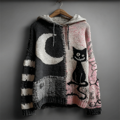 Halloween Black Cat & Moon Contrast Patchwork Cozy Knit Hooded Sweater