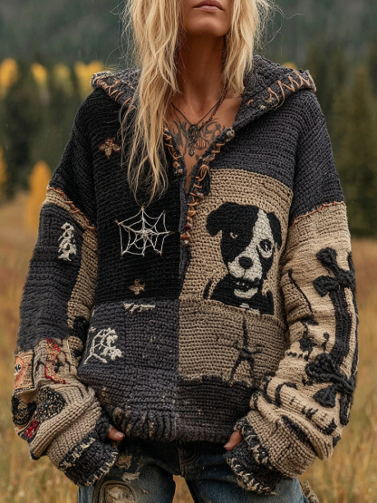 Halloween Dog Patchwork Stitched Cozy Knit Hoodie