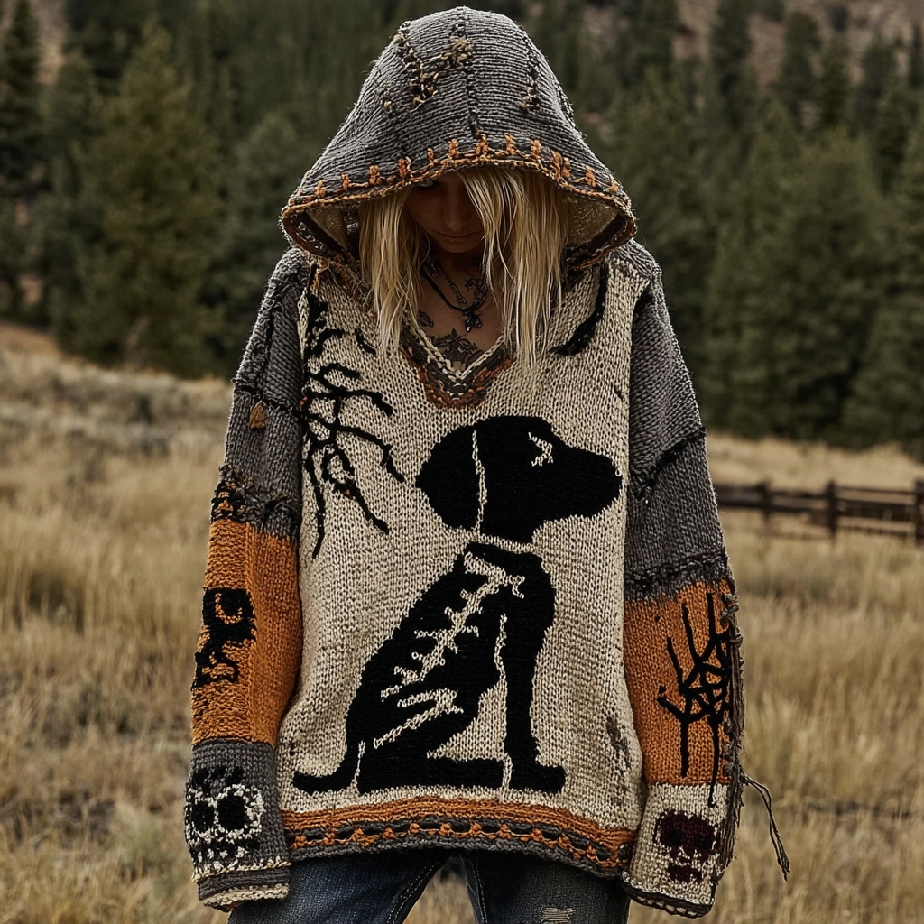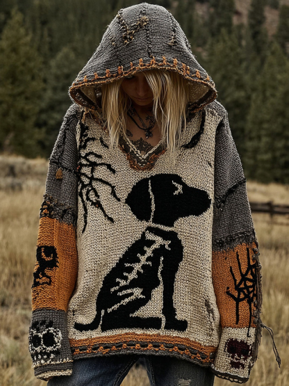 Halloween Dog Spiderweb Patchwork Stitched Cozy Knit Hoodie
