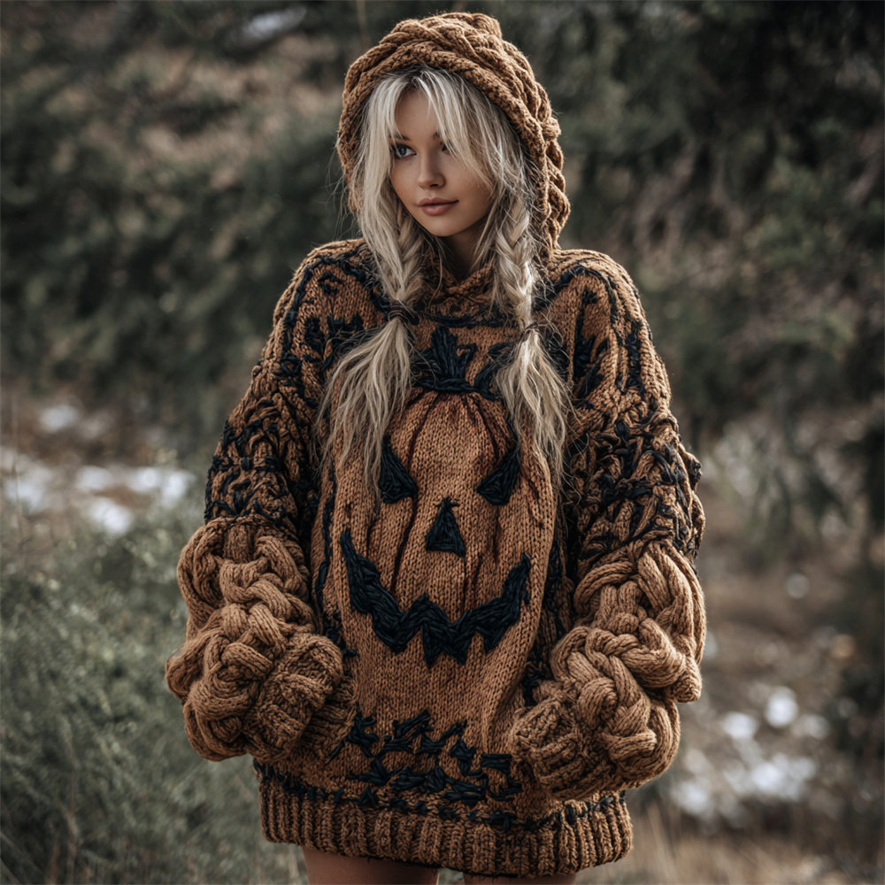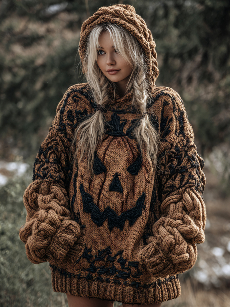 Halloween Evil Pumpkin Face Women's Chunky Knit Hooded Sweater