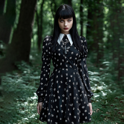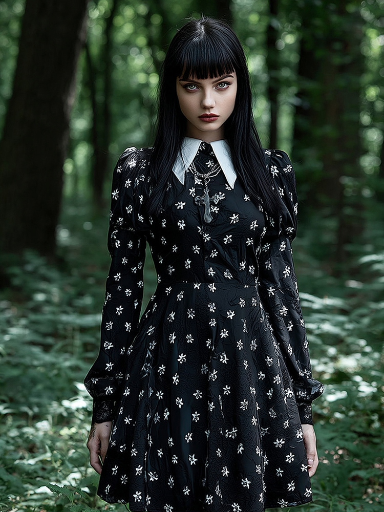 Halloween Gothic Floral Peter Pan Collar Long Sleeve Midi Dress