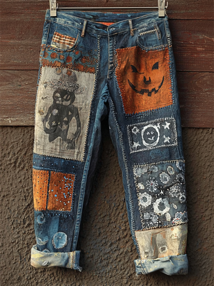 Halloween Pumpkin Inspired Contrast Patchwork Washed Jeans