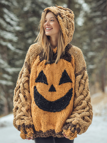 Halloween Pumpkin Lights Women's Chunky Knit Hooded Sweater