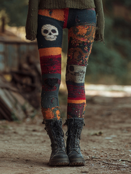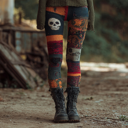 Halloween Skull Pattern Vintage Patchwork Cozy Leggings