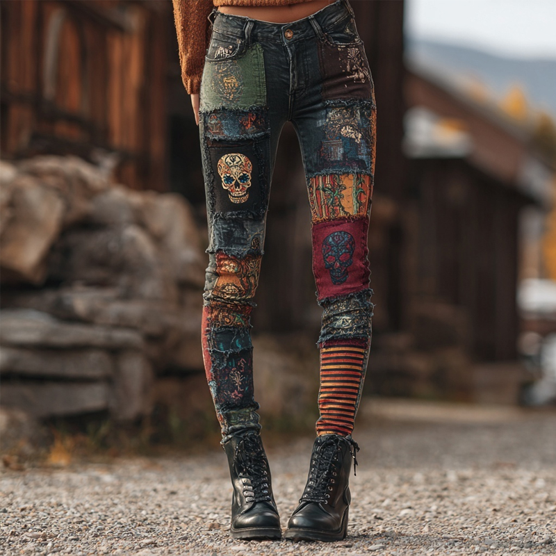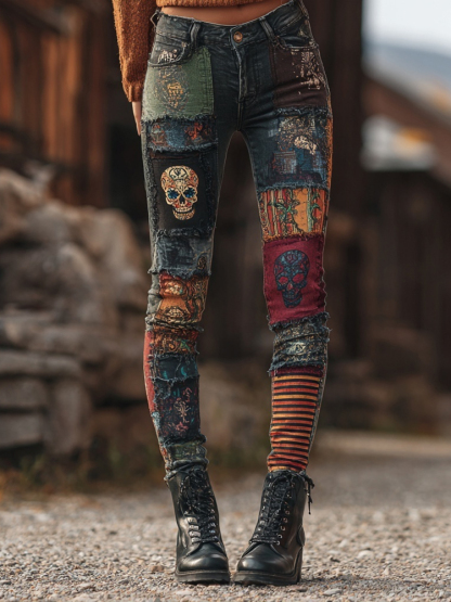 Halloween Skull Pattern Vintage Patchwork Washed Skinny Jeans