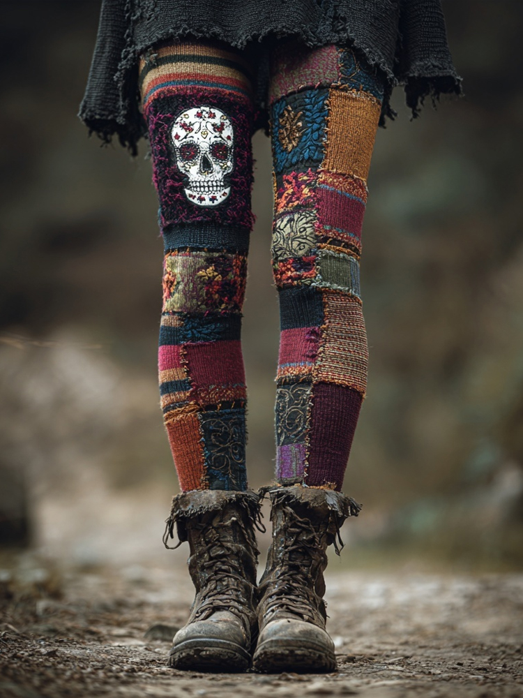 Halloween Skull Vintage Patchwork Cozy Knit Leggings