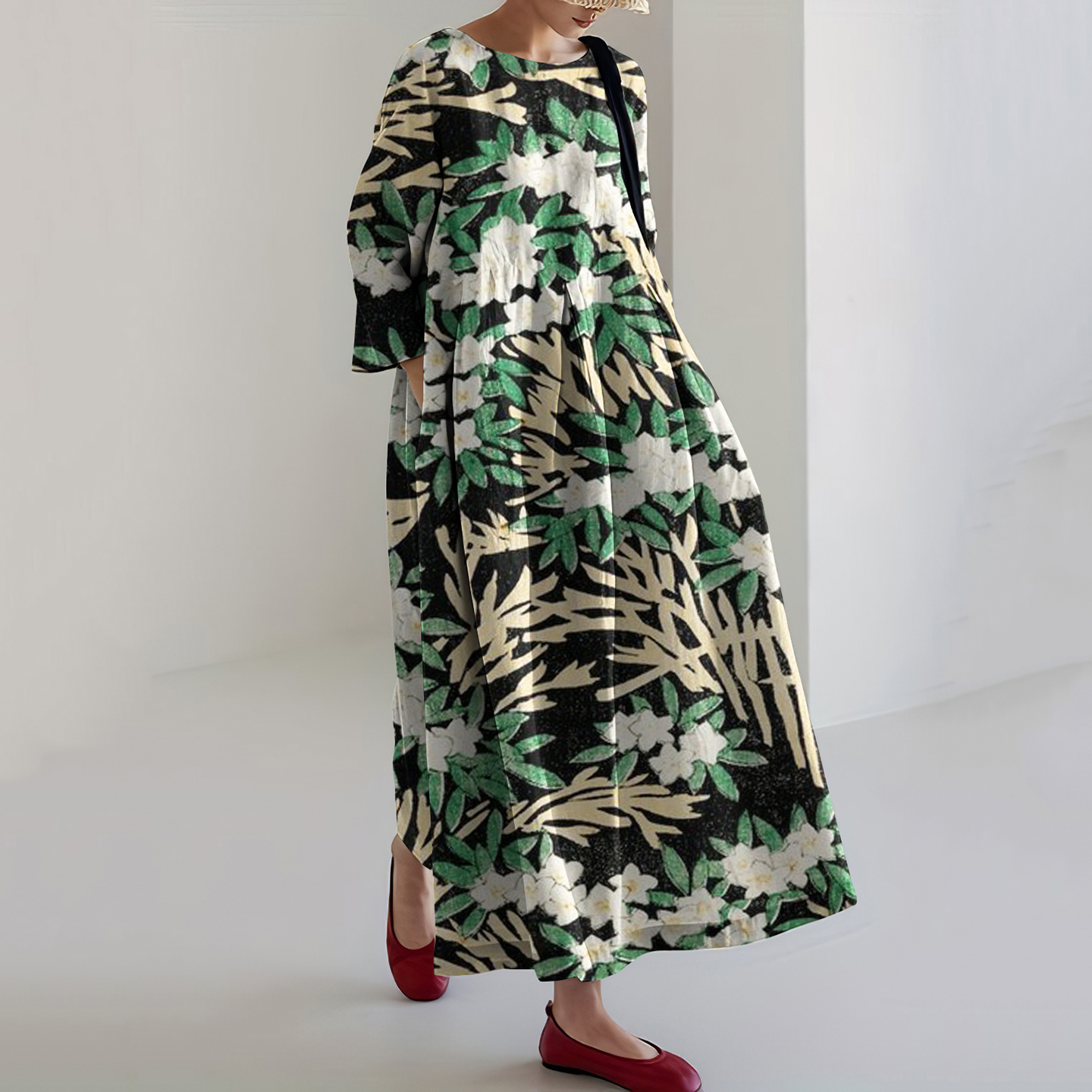 Japanese Art Flower Print Round Neck Loose Midi Dress