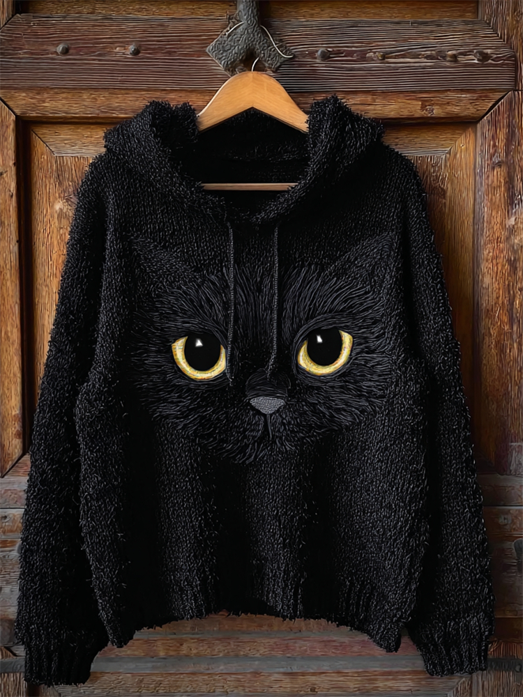 Lovely Black Cat Face Fuzzy Cozy Knit Hooded Sweater