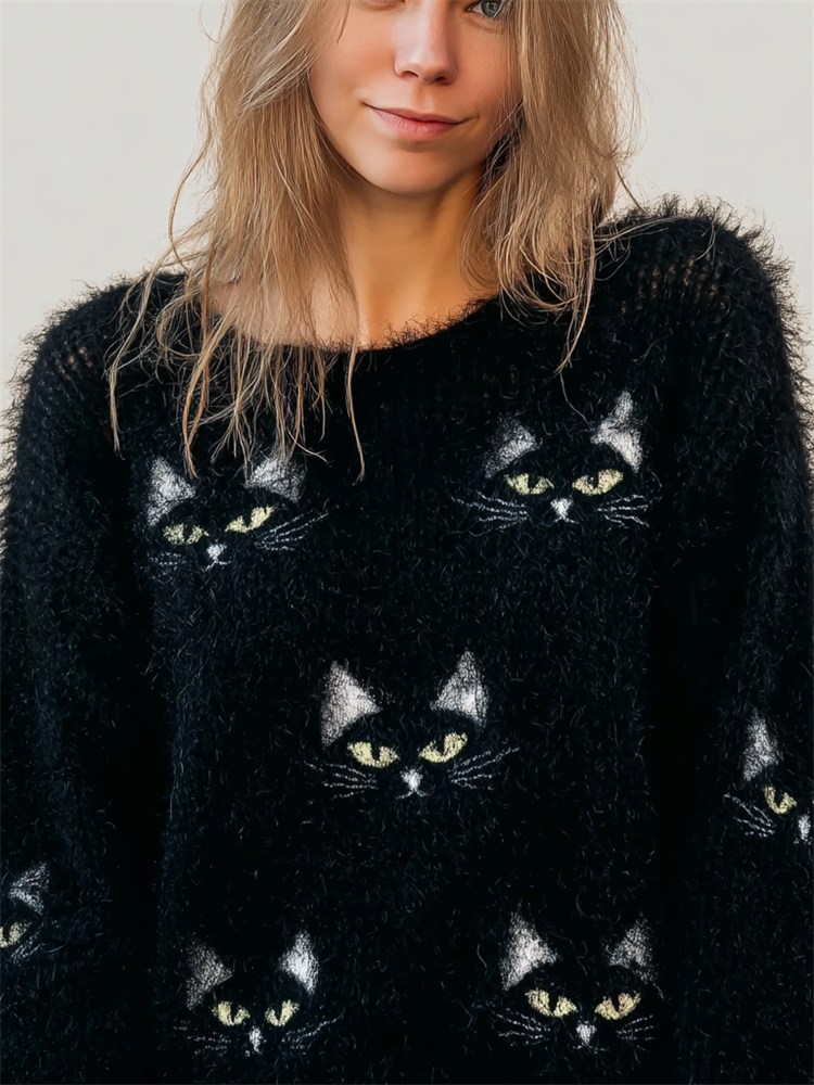 Lovely Black Cat Faces Fuzzy Cozy Knit Sweater