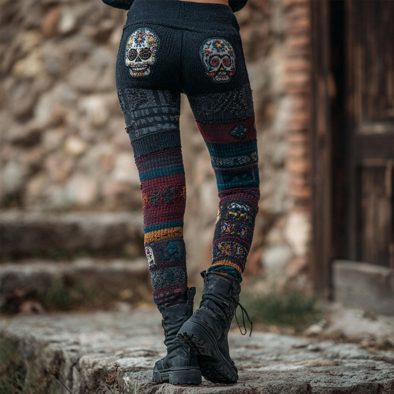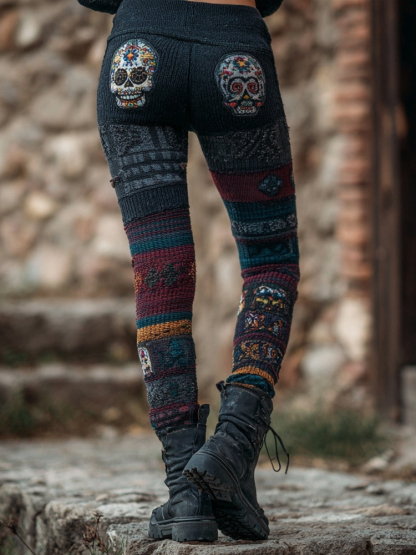 Mexican Sugar Skull Embroidered Vintage Cozy Leggings