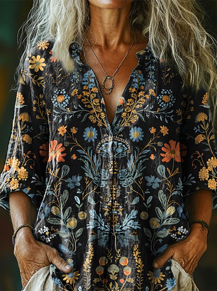 National Flowers pattern Symmetry Women's Print Casual Cotton Linen Shirt
