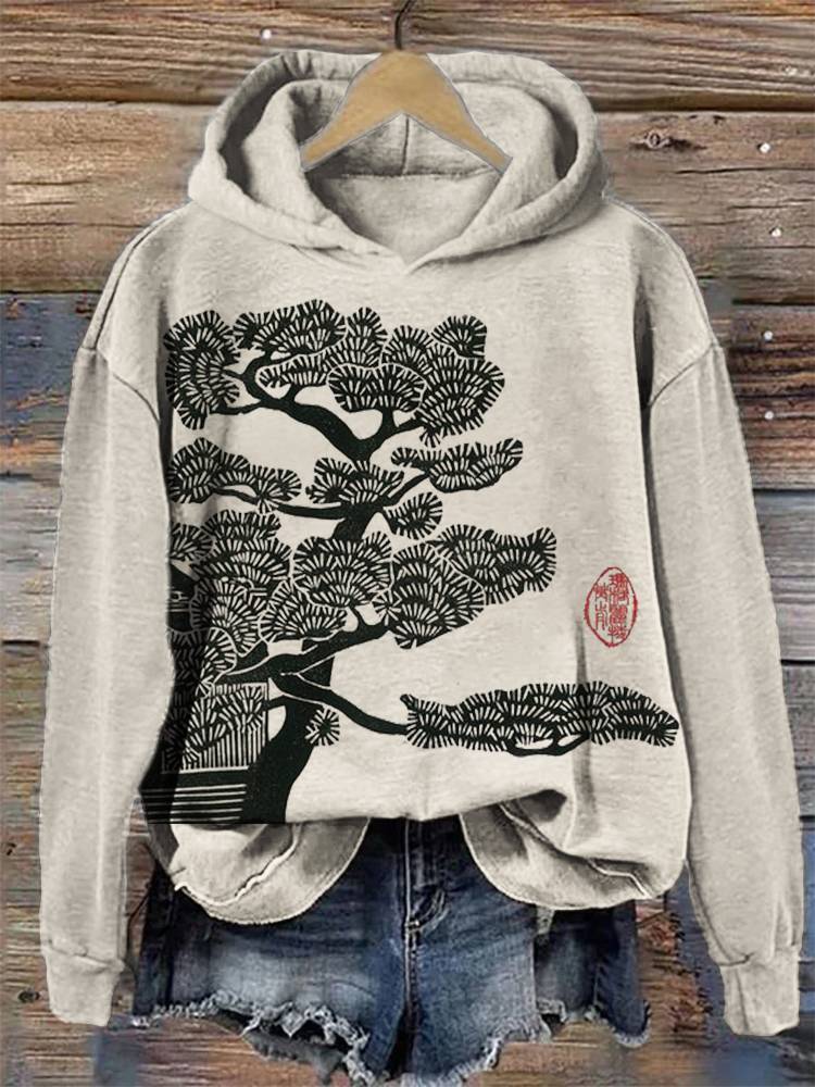 Pine Tree Japanese Lino Art Cozy Hoodie