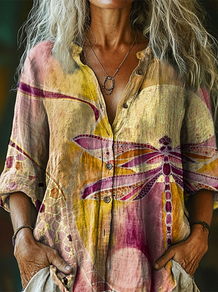 Pink Moon Dragonfly Women's Print Casual Cotton Linen Shirt