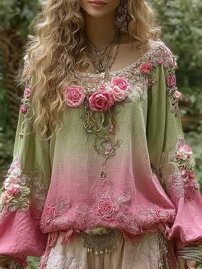 Pink Rose Embroidery Print Round Neck Long Sleeve Linen Blend T-shirt