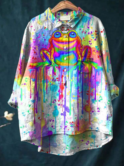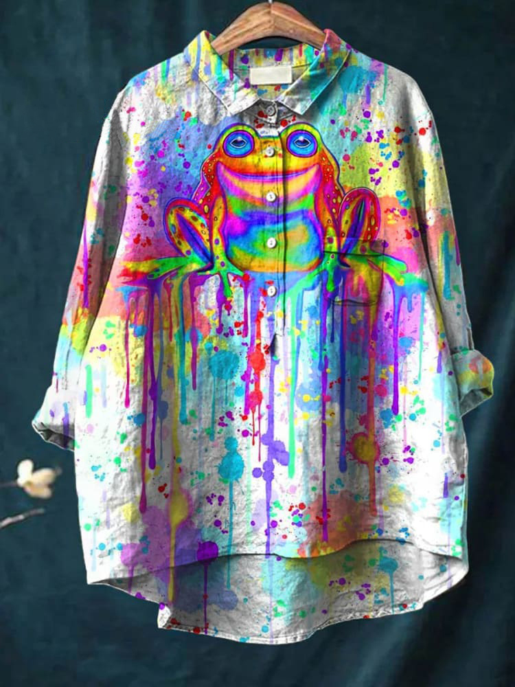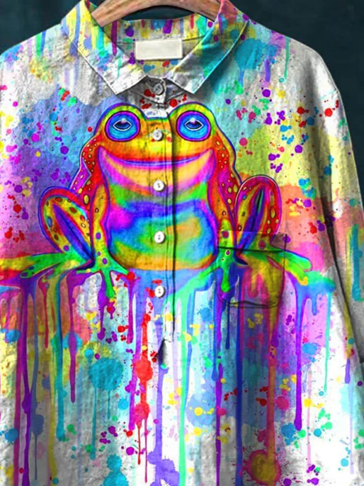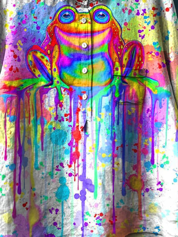 Rainbow Frog Watercolor Art Pattern Print Casual Cotton And Linen Shirt