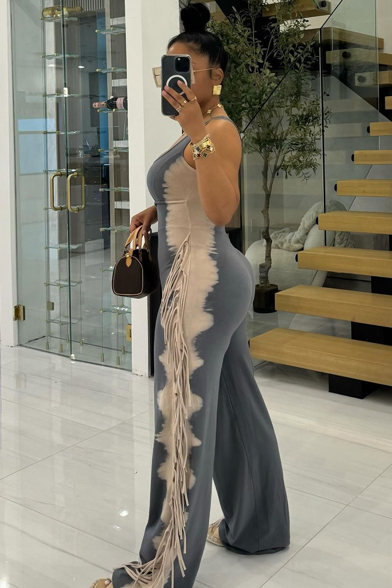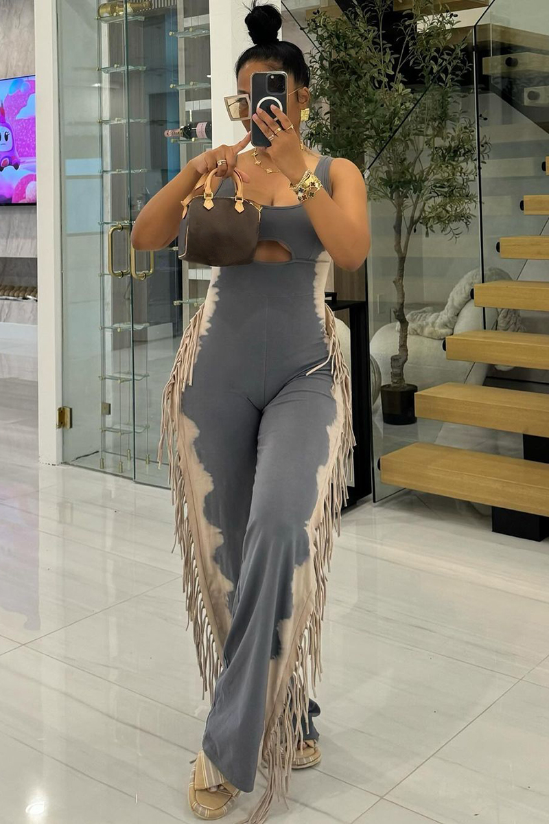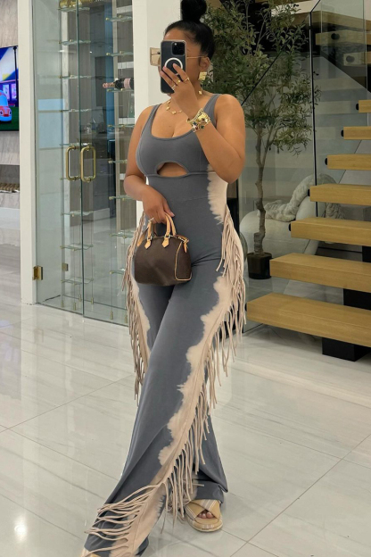 U Neck Cutout Wide Leg Side Fringed Sleeveless Jumpsuit-Grey