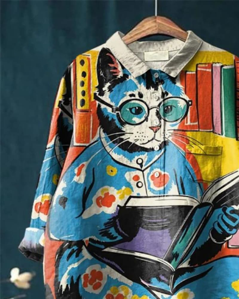 Vintage Cat Art Print Casual Cotton And Linen Shirt