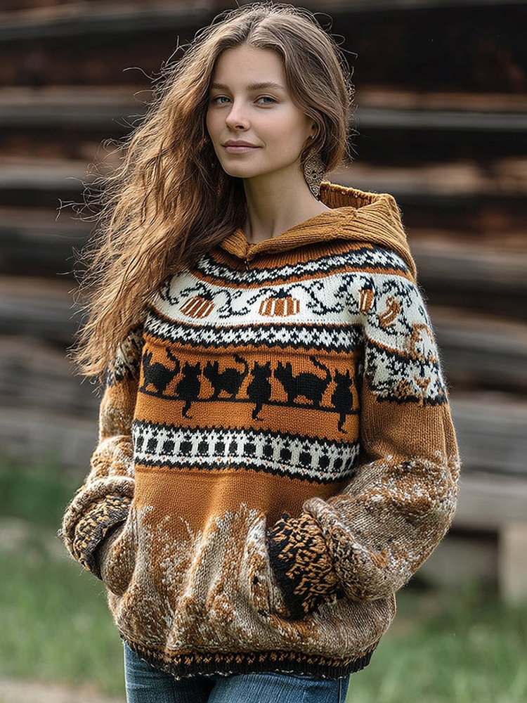 Vintage Fairman Island Halloween Pumpkin And Black Cat Pattern Hooded Sweater
