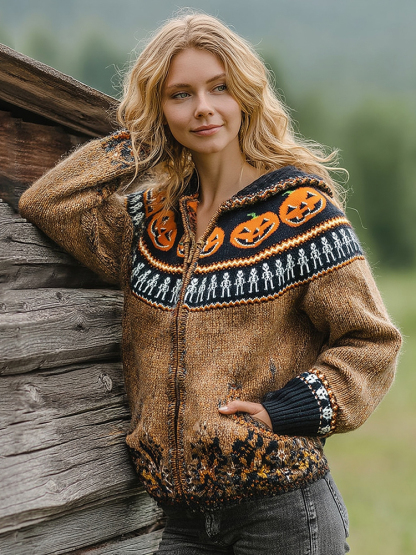 Vintage Fairman Island Halloween Pumpkin Face Hooded Zip-up Cardigan Sweater