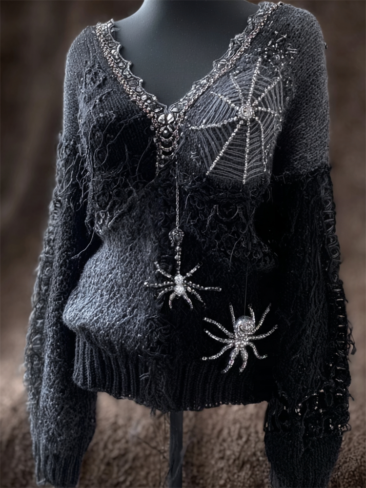 Vintage Gothic Crystal Spiders & Spiderweb Embroidered Cozy Sweater