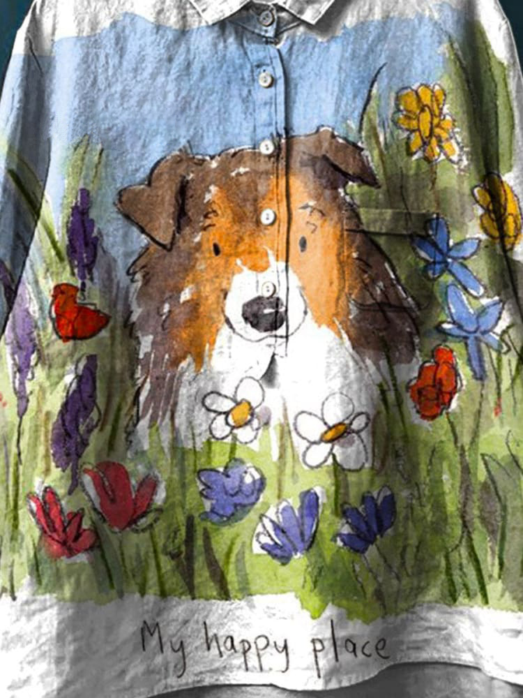 Vintage Lovely Dog Floral Art Print Casual Cotton And Linen Shirt