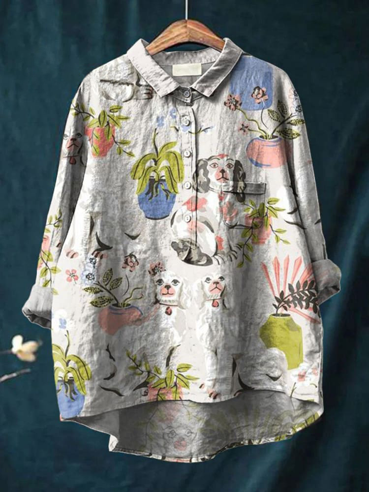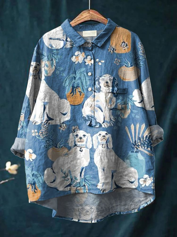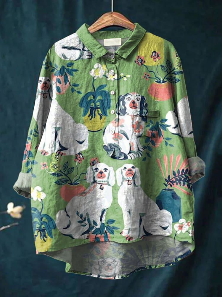 Vintage Lovely Dogs Art Print Casual Cotton And Linen Shirt