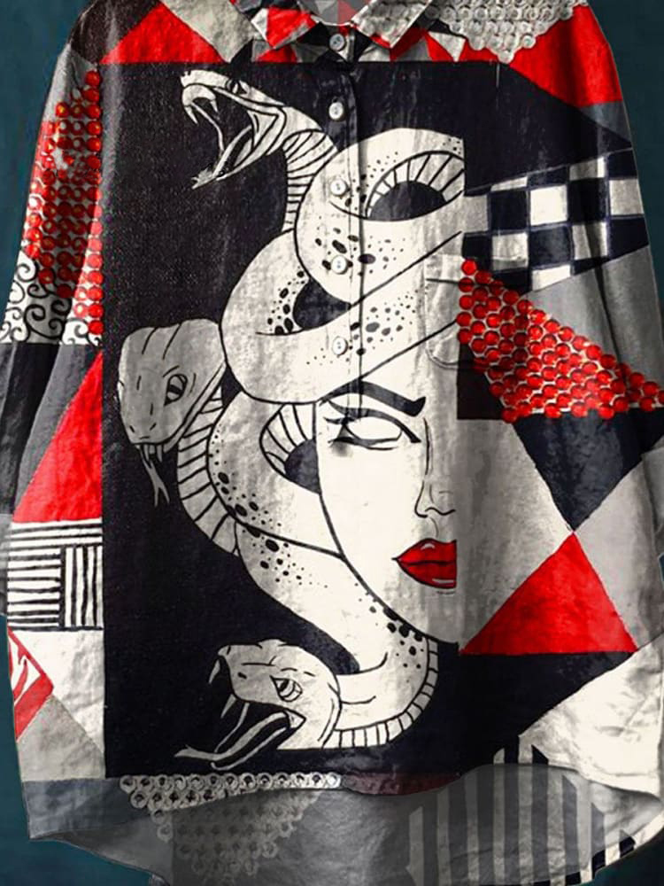 Vintage Medusa Geometric Pattern Art Print Casual Cotton And Linen Shirt