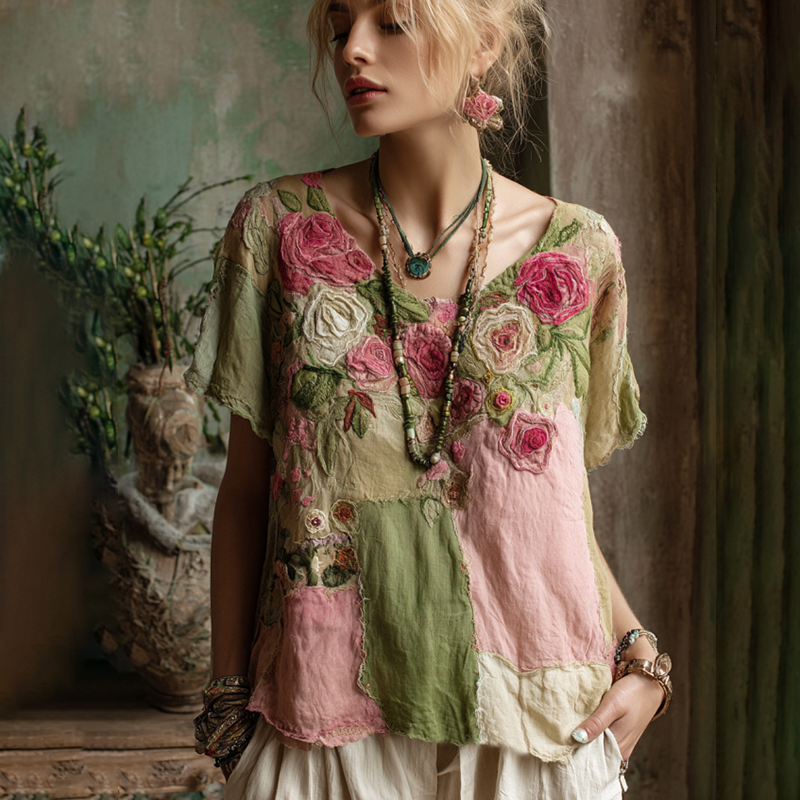 Vintage Pink Roses Patchwork Art Linen Casual Tunic