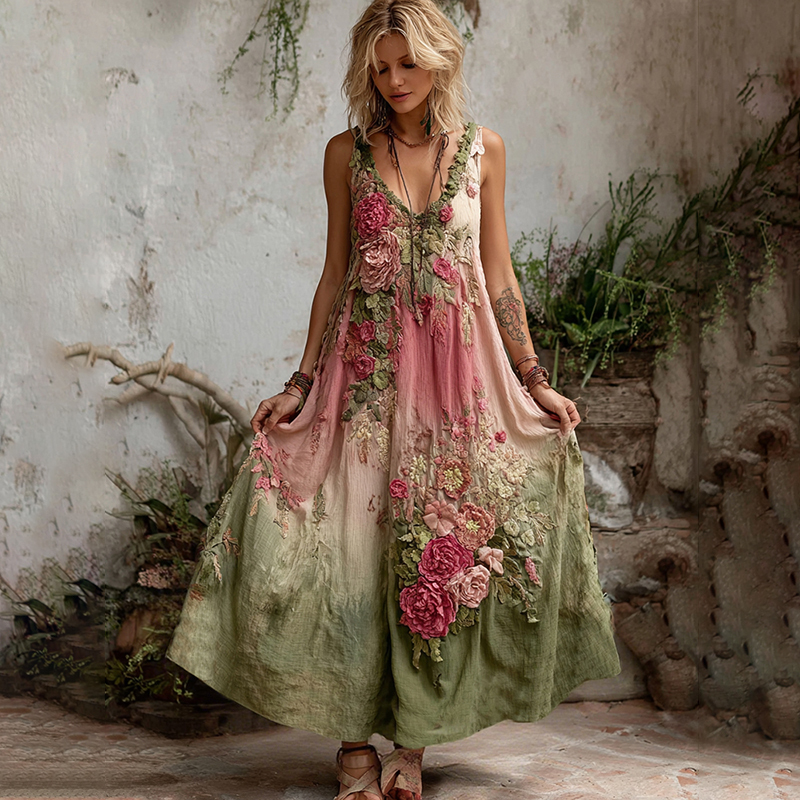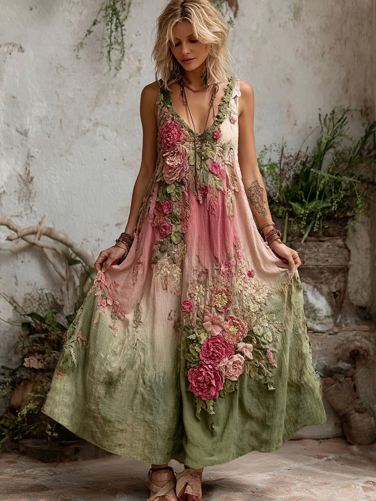Women Vintage Floral Art V Neck Linen Maxi Dress